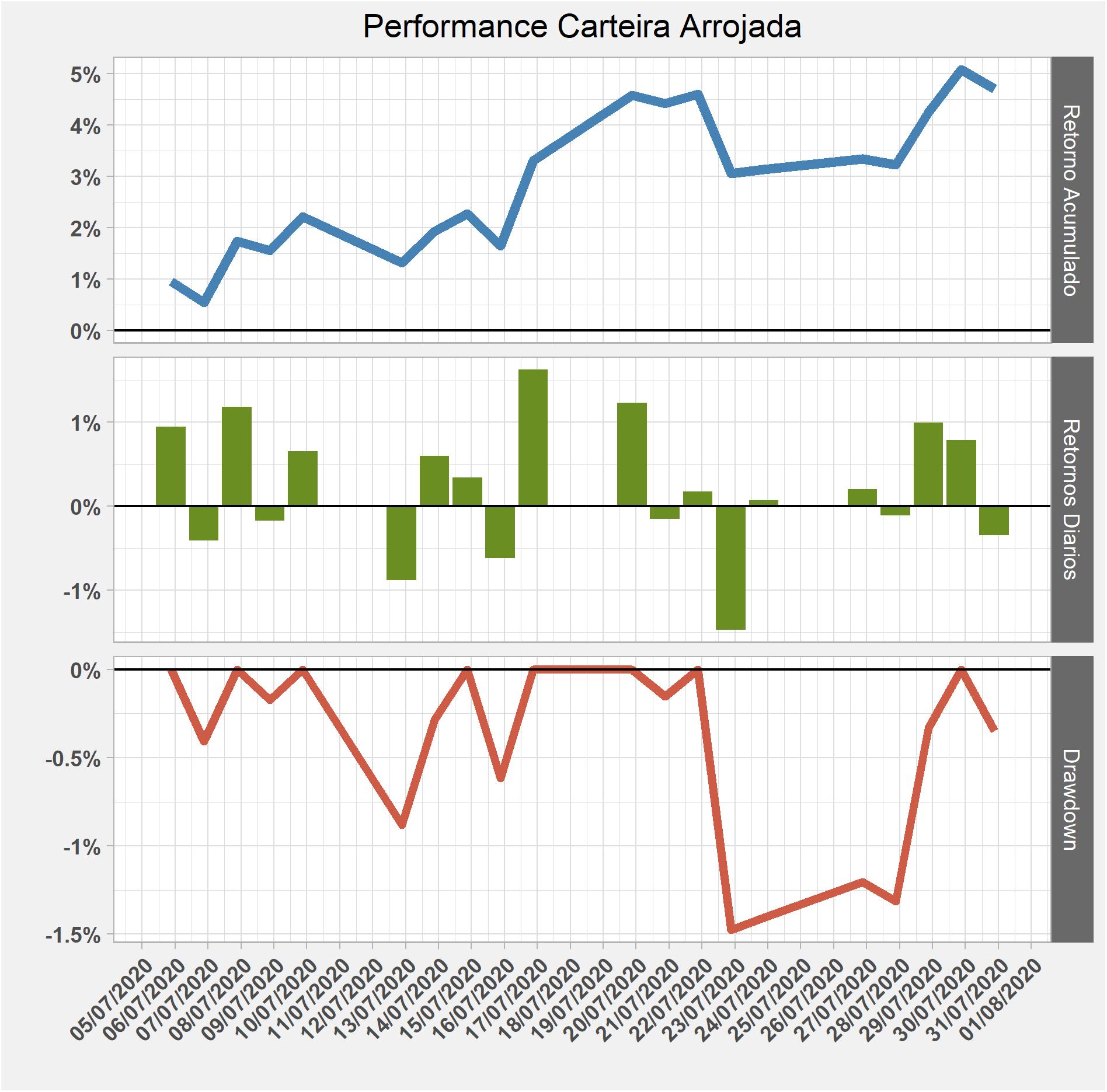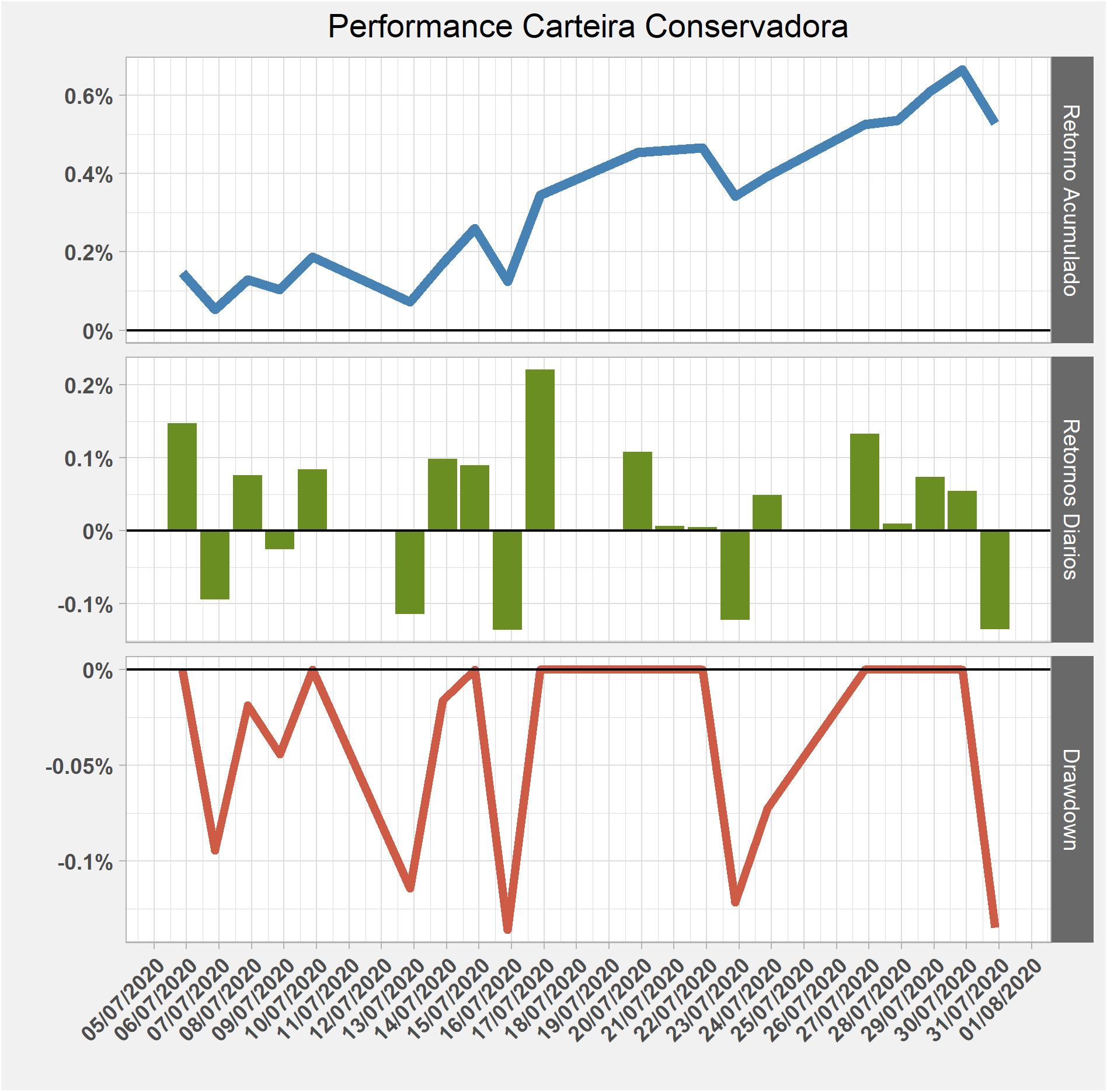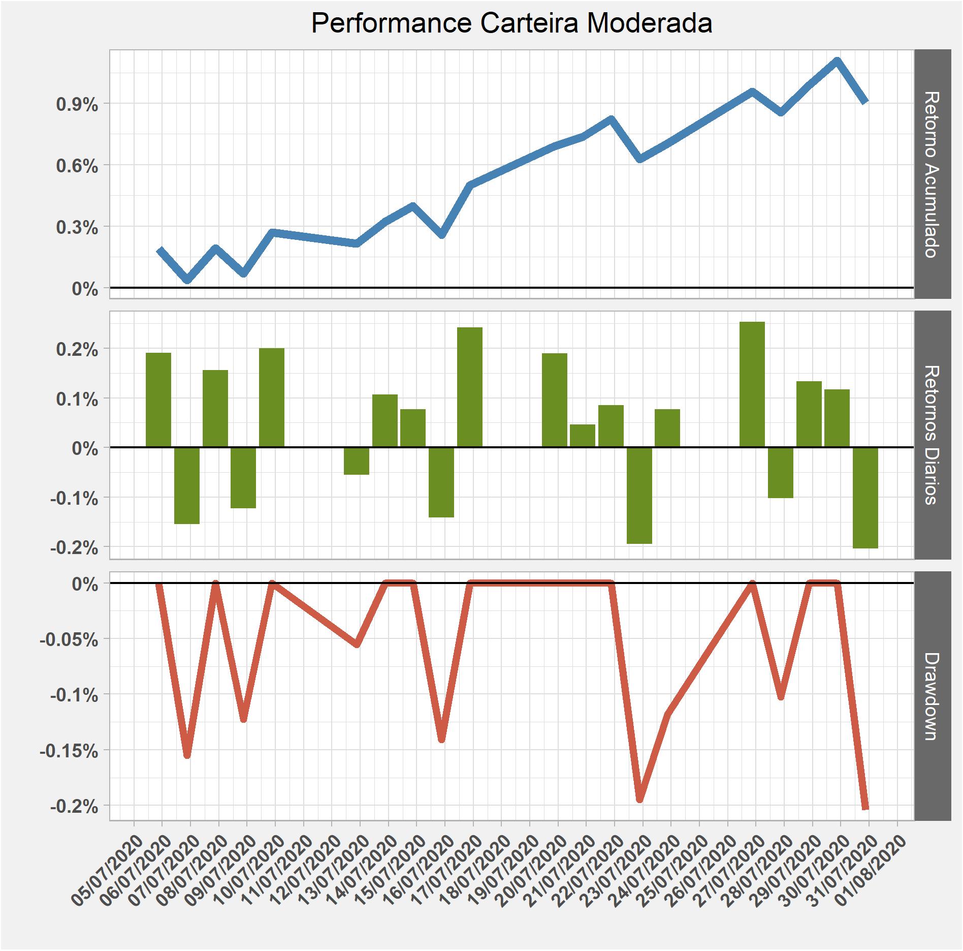 Depois de uma semana com desempenhos medianos, a quarta semana foi de bons retornos para todas as carteiras. A carteira arrojada voltou a mostrar um excelente desempenho, rendendo 1.53% na semana e acumulando 4.7% no mês de julho. Como começamos a série no dia 06/07, ainda falta na prática uma semana para o fim do primeiro mês da carteira e todas elas apresentam um desempenho muito bom dado o risco de cada uma. A carteira moderada já alcança quase 1% no mês (0,9%), rendimento excelente dado que o CDI hoje se encontra em 1,9% ao ano! A carteira conservadora, apesar de possuir um retorno um pouco menor, também apresenta bons resultados com 0,53% em julho (7% anualizados).